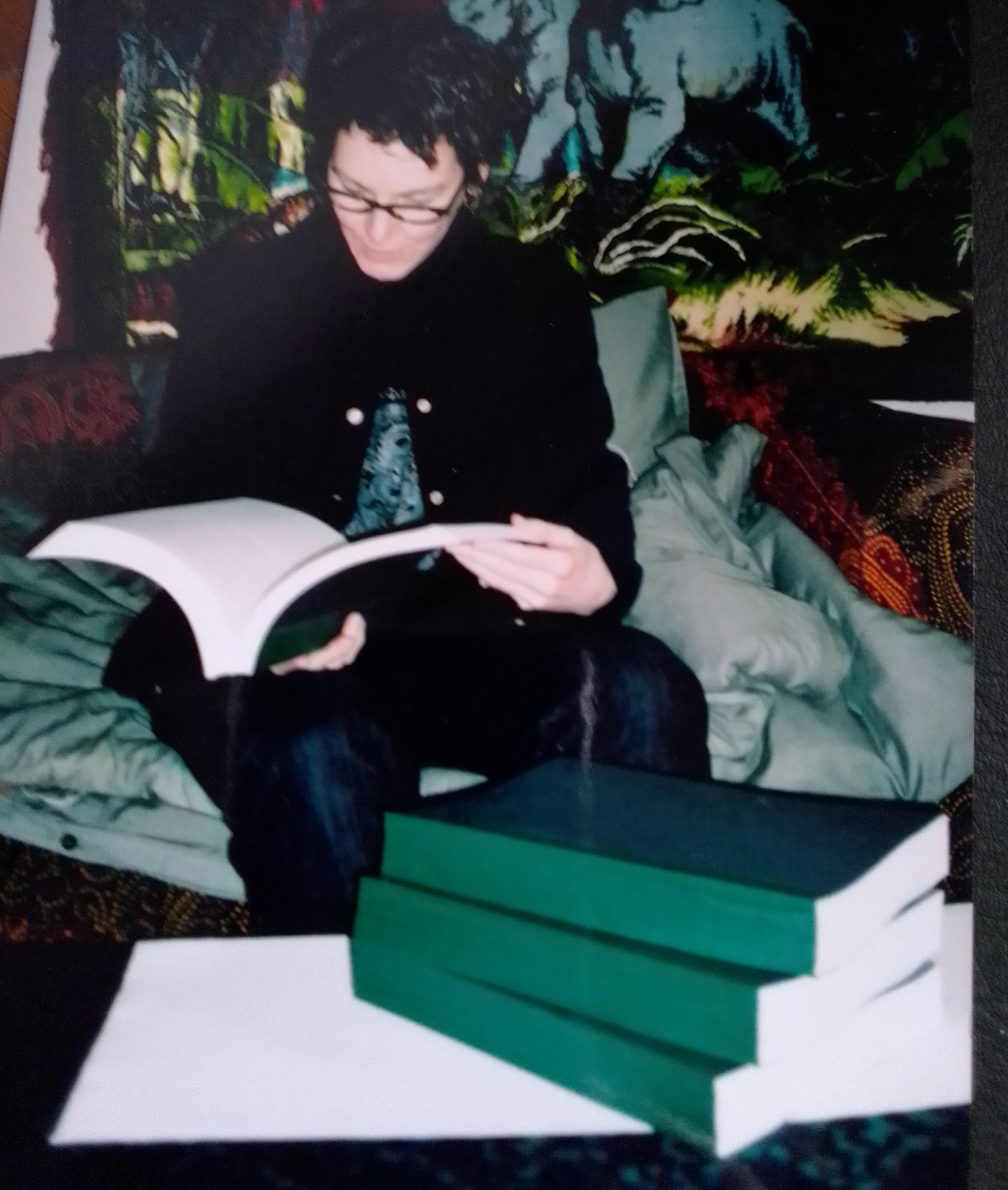 Here’s a photo of me in 2006 in my Melbourne lounge-room, ready to submit my PhD. After I began losing the ability to walk in the early 2000s, I had to leave my full time job. For 10 months I worked for 20 minutes on some days to finish my thesis and PhD novel. The four PhD tomes were too heavy for me to deliver in person – you can’t carry much when you use a walking stick.